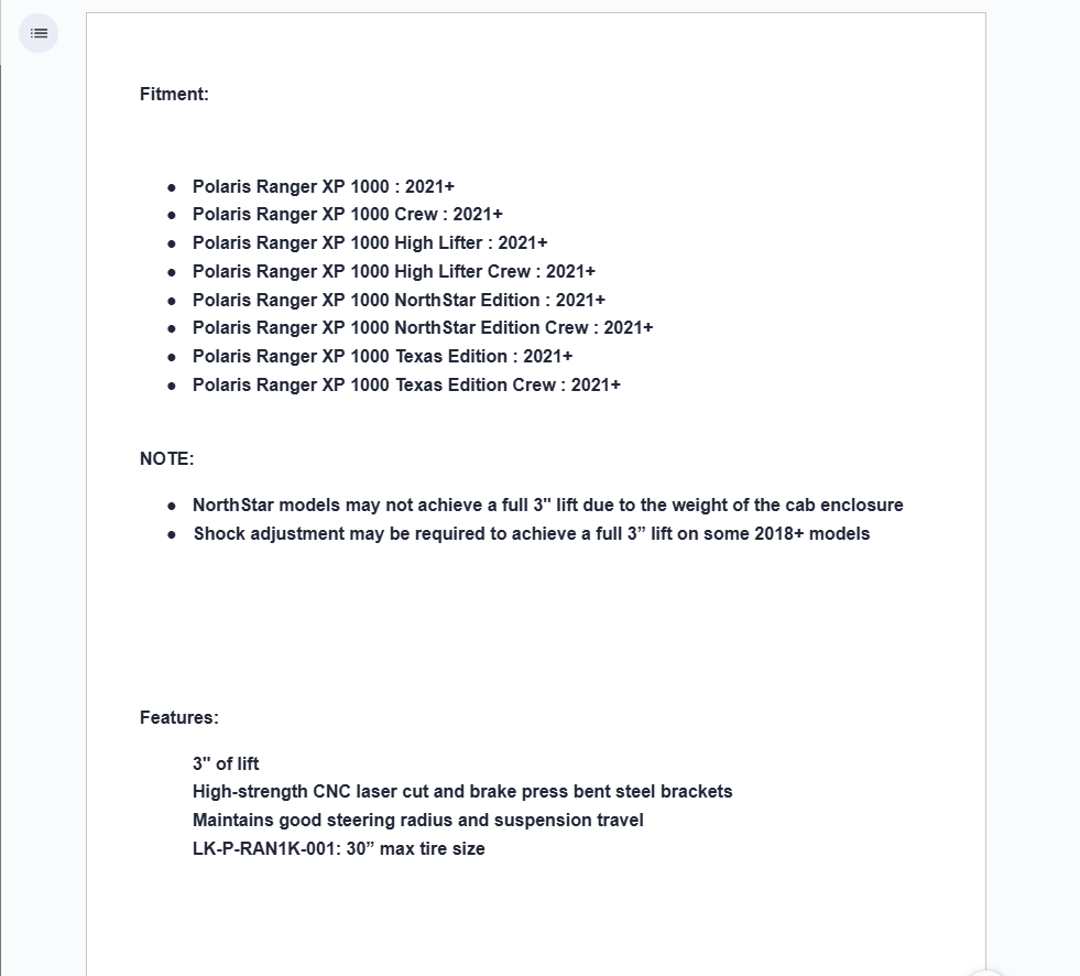With a trusted Polaris Ranger 1000 Full Size lift kit, is there anything you can’t do? That extra ground clearance lets you take the road less traveled and blaze a new trail. With clearance for up to 30” tires on some models, you’ll have the big, awesome-looking machine you need (and want).