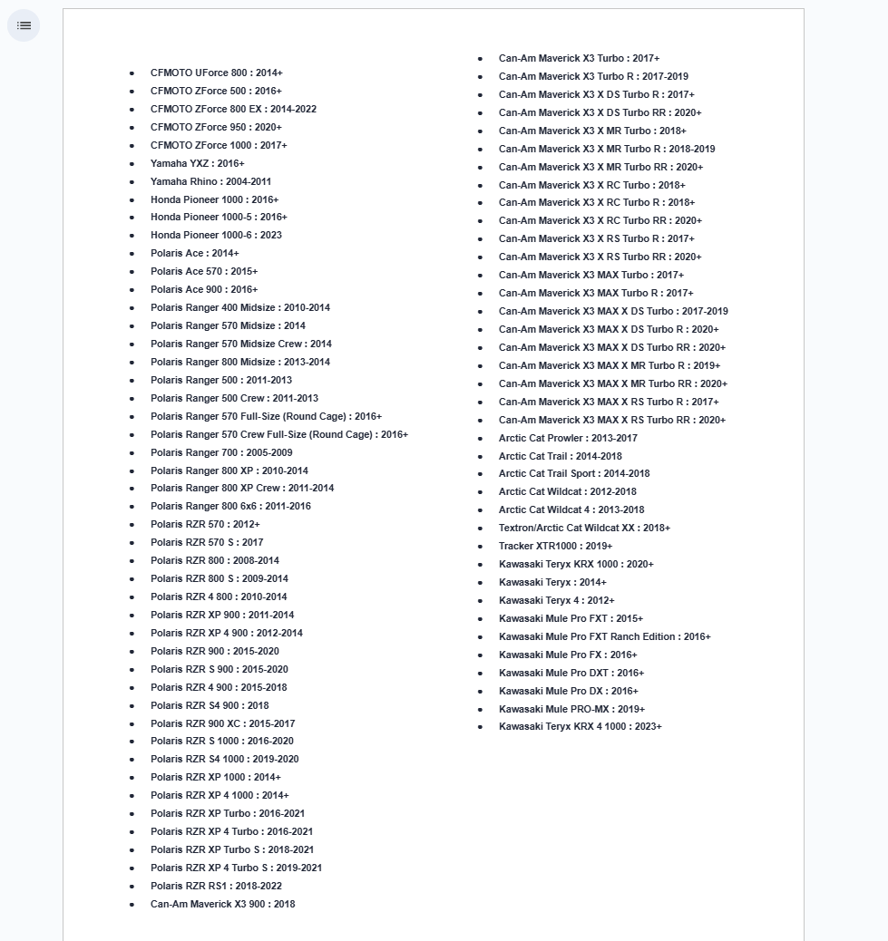 - Polaris RZR S 1000 : 2016-2020