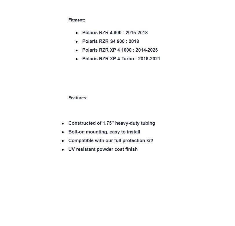 SuperATV’s nerf bars are built to last with 1.75” diameter heavy-duty steel tubing—tough enough to handle the weight your RZR 4 900 can throw around. To top it off, we covered these tree kickers in a durable, UV resistant powder coating to keep them looking good for years. We didn’t skimp out on any details and designed this kit to fit your 4 seater securely and easily so you can slap it on your machine and go with as little down time as possible.