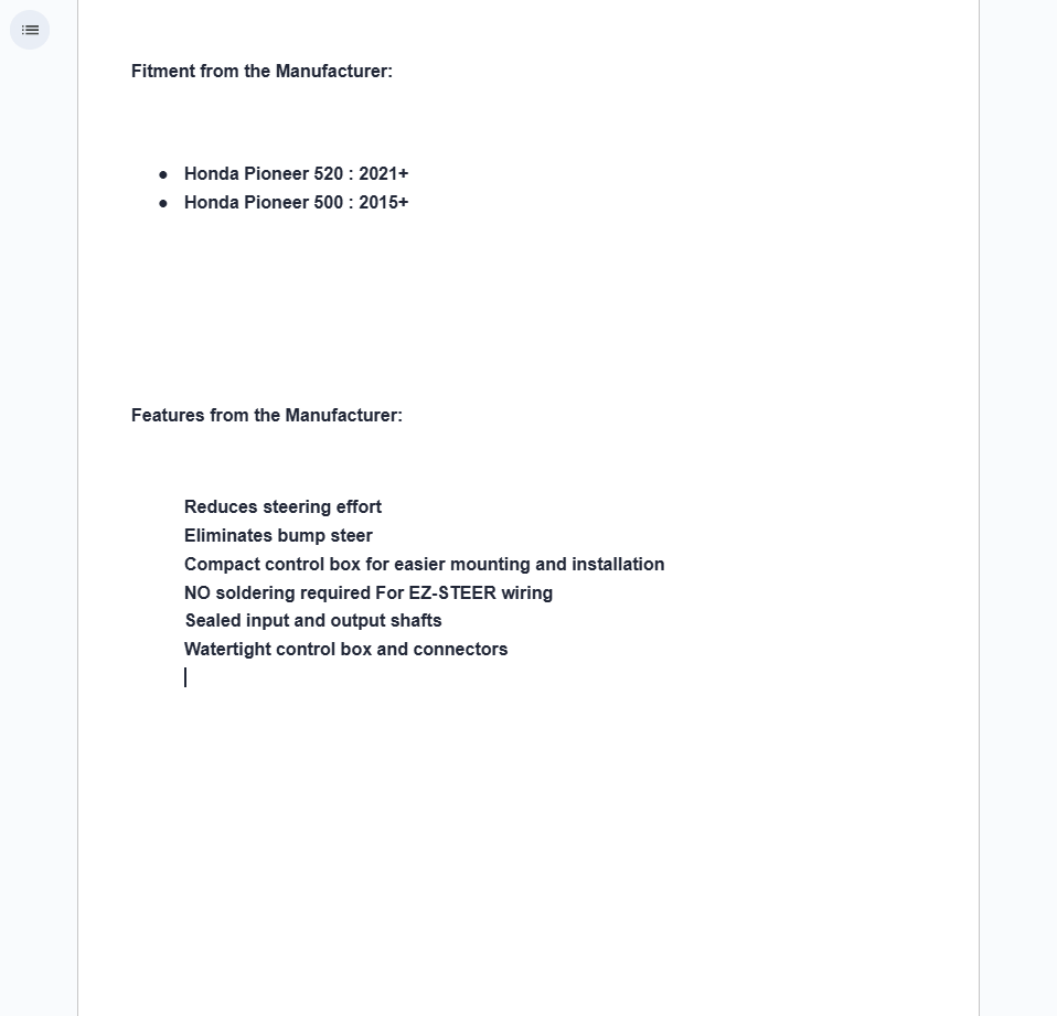 EZ-STEER power steering kit for the Honda Pioneer is the most advanced kit on the market. Designed to make your ride better, EZ-STEER drastically reduces steering effort allowing for longer more enjoyable rides. Along with enhanced steering, power steering will virtually eliminate bump steer and provide a smooth and consistent ride.