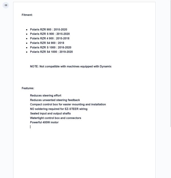 EZ-STEER power steering kit for the Polaris RZR 900 is the most advanced kit on the market. Designed to make your ride better, EZ-STEER drastically reduces steering effort allowing for longer more enjoyable rides. Along with enhanced steering, power steering will virtually eliminate bump steer and provide a smooth and consistent ride.