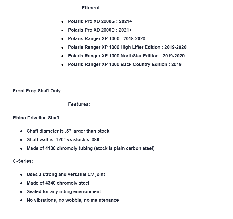 Put a Rhino Driveline Prop Shaft in your Polaris Ranger XP 1000 and watch it work harder than it ever has before. Maximized shafts paired with C-Series CV joints that wear less and run smooth mean it can withstand tons of torque. Bolster your driveline’s backbone with SuperATV’s expertise. Upgrade to a Rhino Driveline Prop Shaft and drive your Polaris Ranger XP 1000 like you never could before.