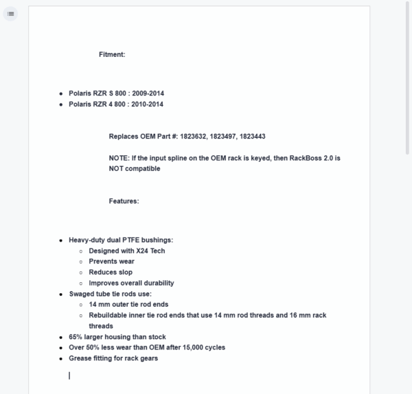 Old racks give you unresponsive steering, and we know the rack on your RZR 800 has been around the block a time or two. Upgrade to SuperATV’s Polaris RZR 800 RackBoss 2.0 Rack and Pinion to get durability to last a lifetime. We built on the strengths of our original RackBoss by upgrading it with our unmatched X24 Tech dual-bushing design. It reduces wear by over 50% compared to stock, making it the longest-lasting rack you can get. That strength and reliability make it perfect for steering massive tires on nasty terrain without snapping parts left and right.