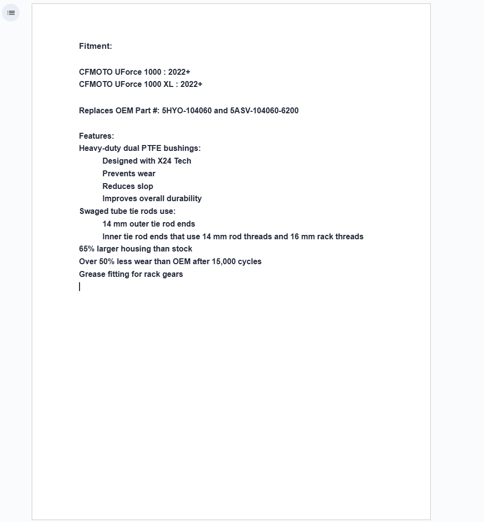 You like to push your CFMOTO UForce 1000 to the limit, which means your stock steering rack is wearing out. This can leave your handling feeling a little loose. That’s where SuperATV’s RackBoss 2.0 comes in. With our X24 Technology, they’re built to last longer and resist wear by more than 50%. Whether you’re tackling tough trails, working on the farm, or running larger tires, you’ll get sharper and more precise steering that’ll last for years.X24 Tech Is Where It’s At
