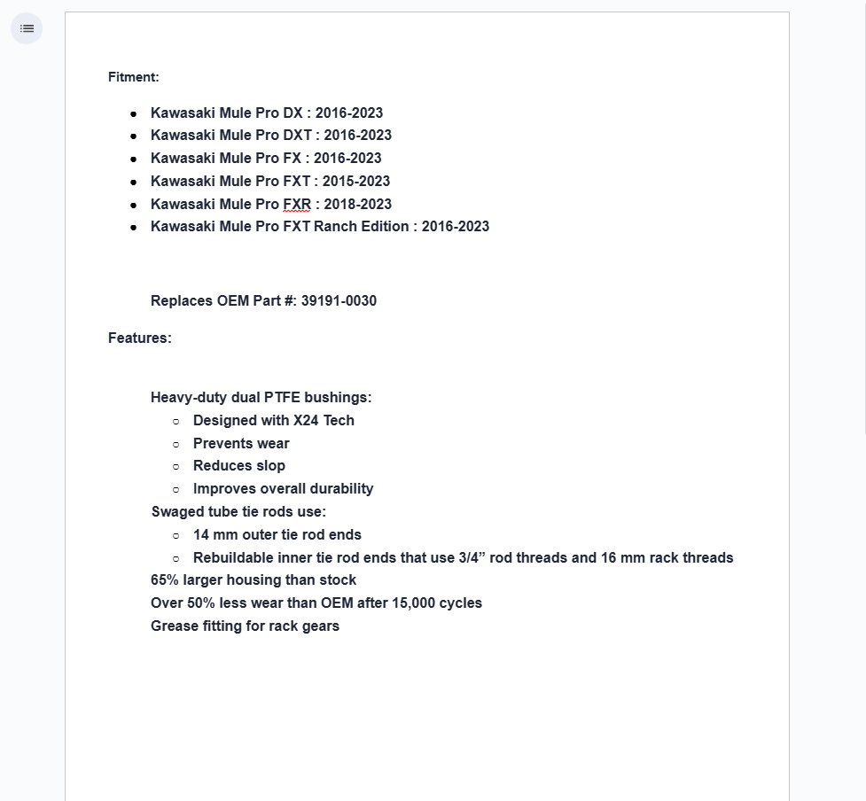 Whether your Mule does work all week or you take it out for weekend adventures, the stock steering rack will wear out eventually. When it does, your steering will feel loose and unreliable. That’s why we built a rack that’s better. Put our RackBoss 2.0 Rack and Pinion on your Kawasaki Mule FXT—it outlasts everything else on the market. Our X24 Tech reduces wear and tear by over 50%. Your steering will be tight and responsive for years no matter how your ride.