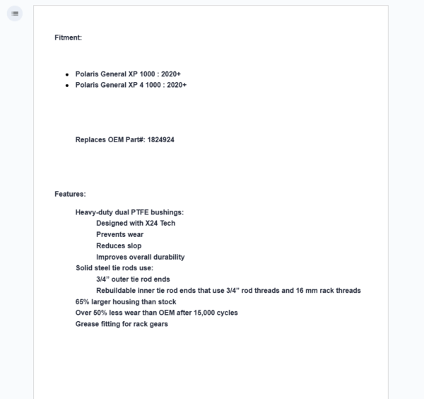You can use your Polaris General for every kind of job and take it on every adventure. That means that your stock steering rack is gonna wear out and make your handling feel loose eventually. That’s why you need our RackBoss 2.0 Rack and Pinion on your Polaris General XP 1000. It’s a better rack that’s designed to outlast everything else on the market thanks to our X24 Technology. Our design reduces wear by over 50% so you can ride all you want, even with massive tires. Your steering will be tight and responsive for years and years.