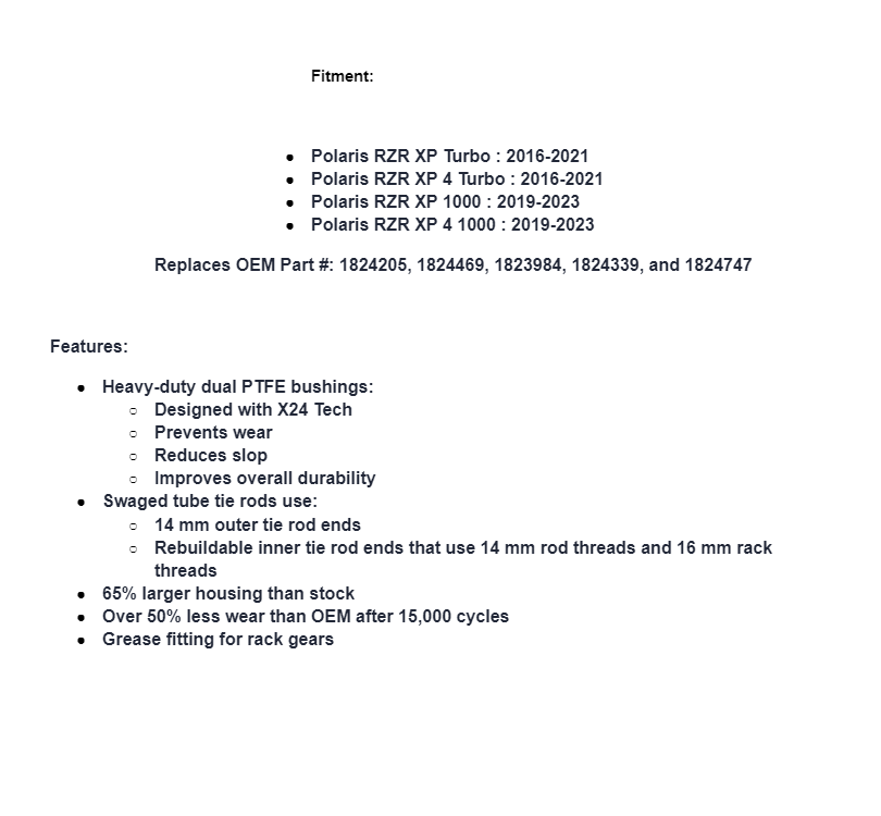 The fate of every rack is to wear down over time, get sloppy, and make your steering responsiveness feel terrible. That all changes with RackBoss® 2.0. It’s an evolution of our original RackBoss and designed to be the strongest, most durable rack on the market. It uses X24 Tech—a dual-bushing design that reduces wear by over 50% compared to stock. You can’t find that kind of improvement anywhere else. Get SuperATV’s RackBoss® 2.0 Rack and Pinion installed on your Polaris RZR XP Turbo so you can turn massive tires on dangerous terrain—no matter how hard or long you ride, this rack keeps you in control.