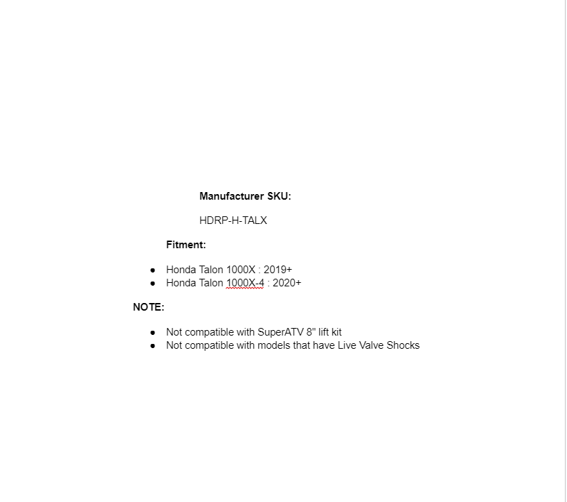 | Honda | Talon 1000X | SXS10S2X | 2021 | Not compatible with SuperATV 8 Inch lift kit or Live Valve Shocks |