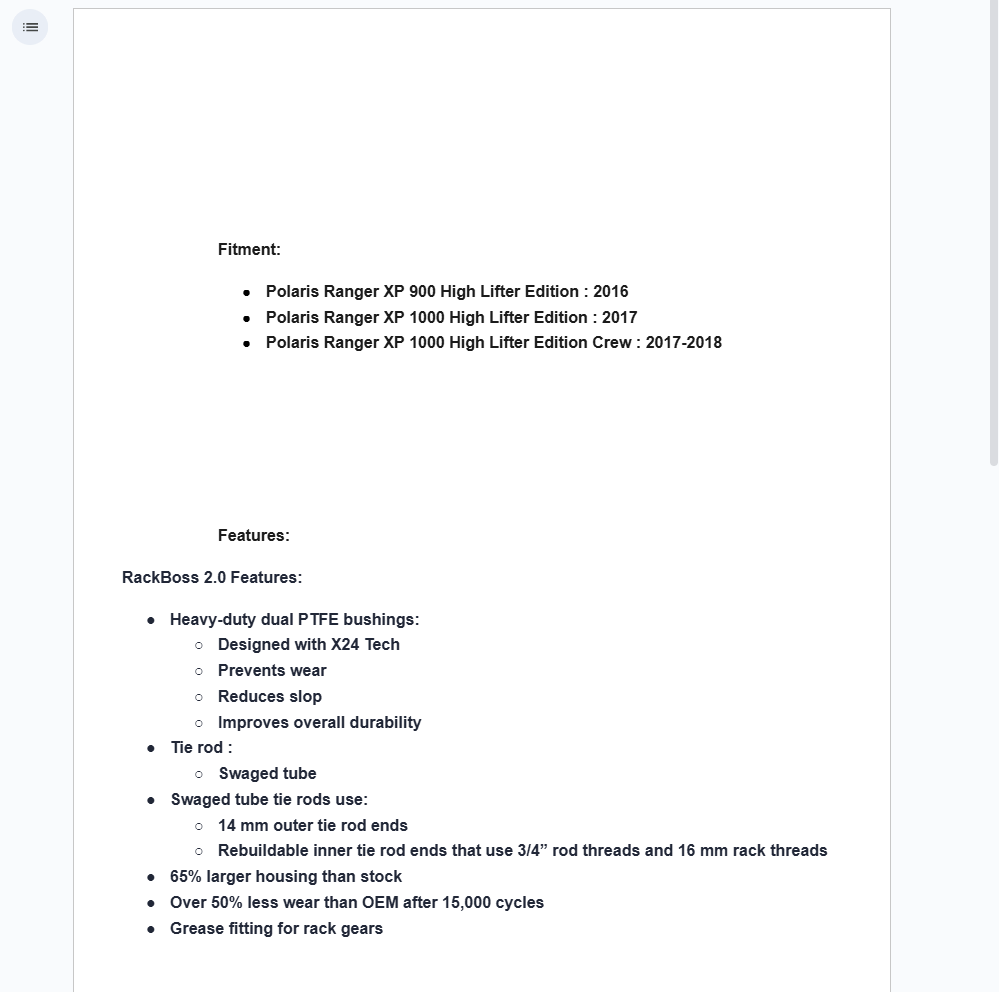RackBoss 2.0 removes almost all unwanted internal play by using our X24 dual bushing design. With heavy-duty PTFE bushings positioned at both ends of the rack, the rack gear and tension spring are nearly motionless. Without extra play, you can ride harder with bigger, heavier upgrades and still see less wear than a stock Honda 1000R steering rack. That durability is boosted even more with the inclusion of a grease zerk that makes it easy to keep it running smooth.