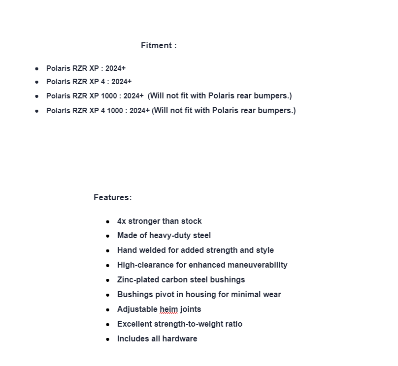 | Polaris | RZR XP 1000 | Ultimate | 2024 | Will not fit with Polaris rear bumpers. |