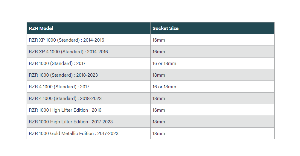 | Polaris | RZR XP | Turbo EPS | 2018 | You MUST measure socket size |