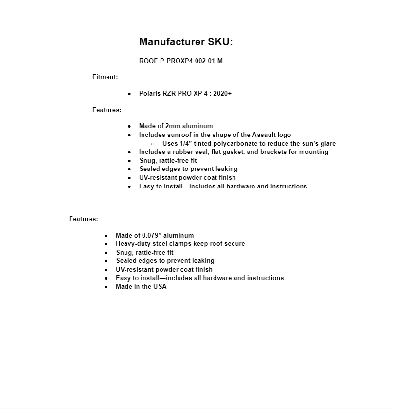 The alarm has sounded and the air raid is real—prepare your Polaris RZR PRO XP 4 by installing Assault Industries’ Aluminum Roof with Sunroof. It’s the overhead protection you need when trail debris goes flying and the sun is high in the sky. We’ve constructed it from 2mm aluminum. Why? Because it’s the best material for deflecting the sun. And because strategy is the name of the game, we’ve added a sunroof layered with a sheet of tinted polycarbonate, so you can see the top of hills as you approach them without having the sun’s glare in your eyes.