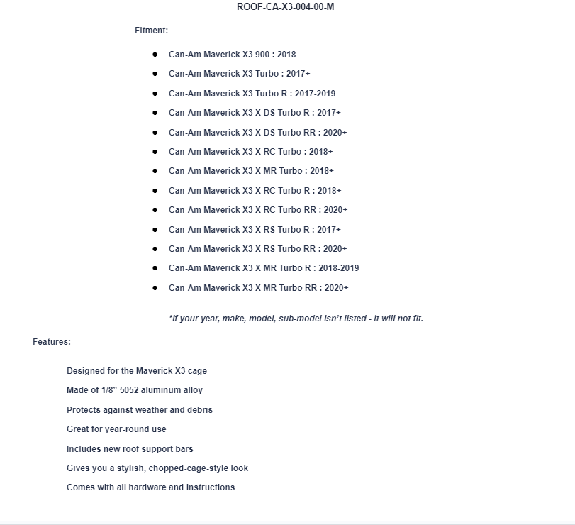 The Can-Am Maverick X3 is all about strength, performance, and style and we’ve built our 1/8” aluminum roof to those standards. Superior strength means it’ll keep out the elements and the rooster tails that your buddy sends up without buckling—it’s great for year-round use. We’ve baked in better performance by making no compromises in design and execution. And, of course, we made sure this all-aluminum roof turns heads while you’re at the ride park.