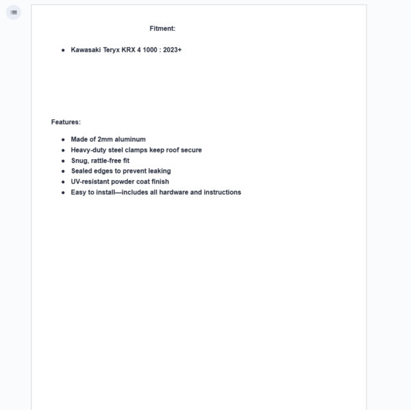 Protect yourself from the sun and the trail by installing SuperATV’s Aluminum Roof to your Kawasaki Teryx KRX 4 1000. It’s made from 2mm aluminum and is cleverly designed to be lightweight so it won’t hold you back.