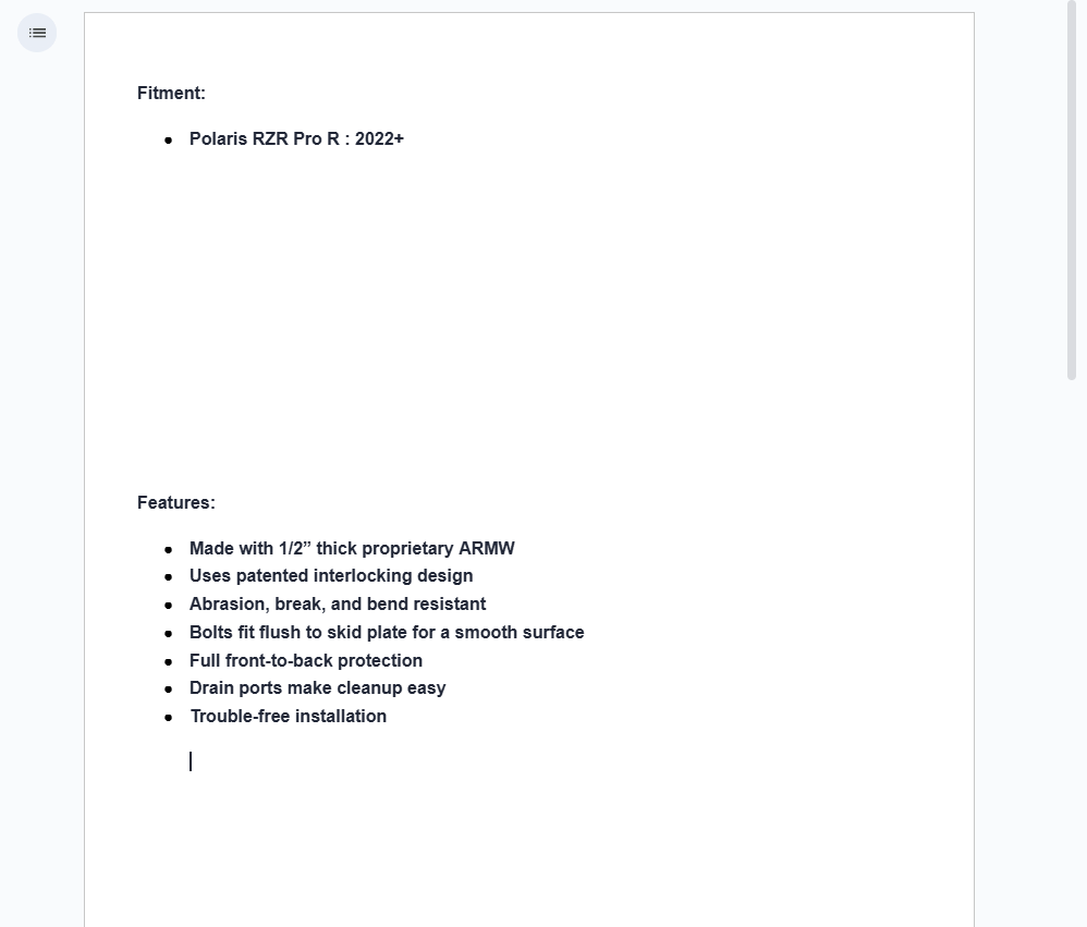 We know what it’s like to get new parts and want to test them out immediately—you can’t get the box opened fast enough. Thanks to our interlocking design, this RZR Pro R skid plate fits your machine specifically to make installation effortless. And our built-in drain ports make washing out mud and trail debris super easy. From unboxing to installation, you’ll have this skid plate on your machine in no time.