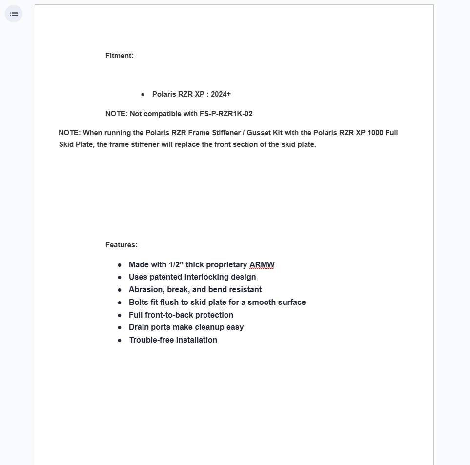 NOTE: When running the Polaris RZR Frame Stiffener / Gusset Kit with the Polaris RZR XP 1000 Full Skid Plate, the frame stiffener will replace the front section of the skid plate.