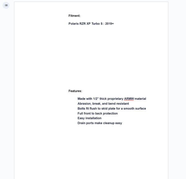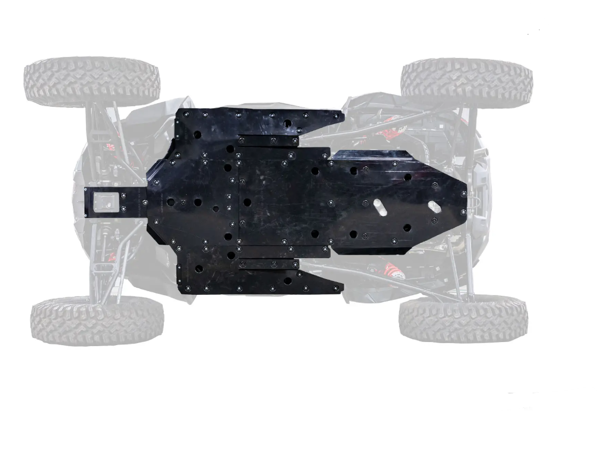 The belly of your RZR tends to be a little too soft. It’s easier than you think for sticks to stab right up through the floorboards and right into… something else. Bolster your belly with SuperATV’s ARMW Skid Plate for the Polaris RZR XP Turbo S. Our proprietary 1/2” ARMW skid plate is ultra-tough and nearly impenetrable. It’s cut to fit your Turbo S perfectly. It attaches securely and seamlessly so branches and rocks can’t get through. It’s smartly designed with drain ports so clean up is easy when you’re back on the trailer. Ride hard and have fun—with our skid plate, you don’t have to worry.