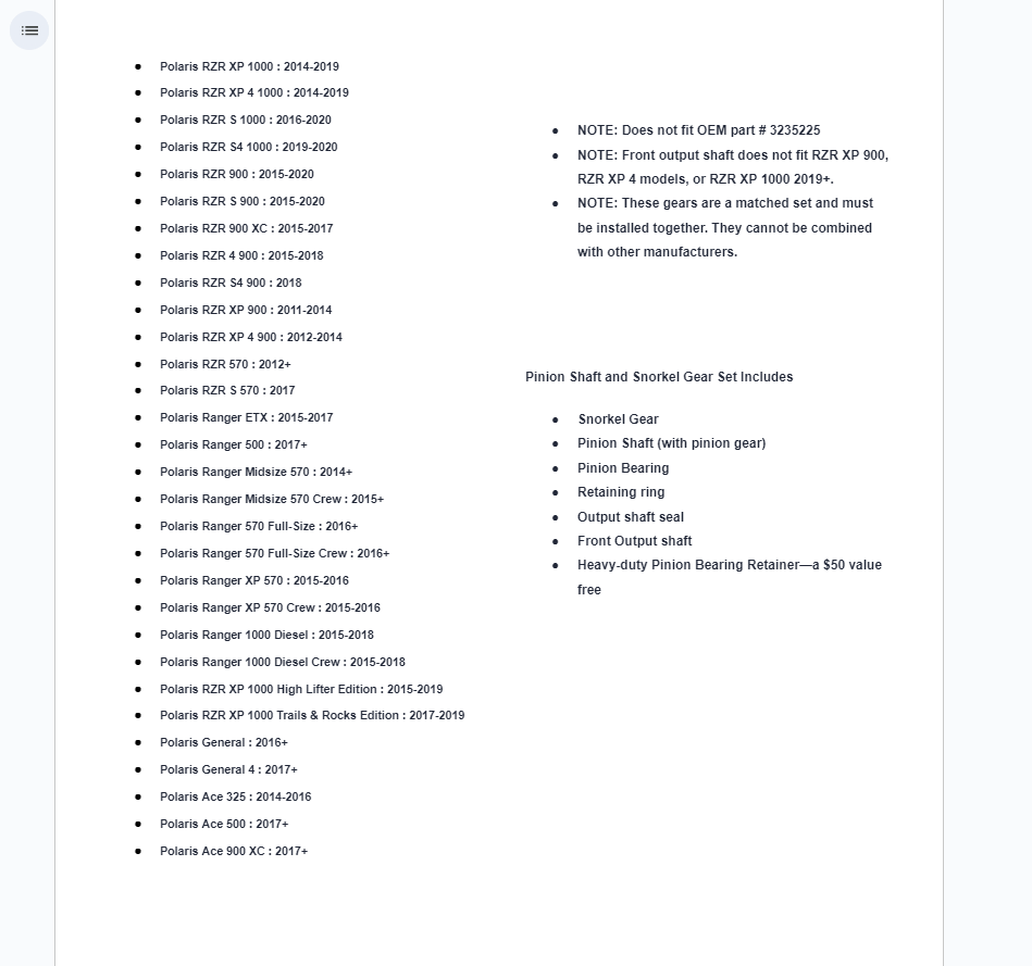 - Polaris Ace 570 : 2015+NOTE: Does not fit OEM part # 3235225NOTE: Front output shaft does not fit RZR XP 900, RZR XP 4 models, or RZR XP 1000 2019+.NOTE: These gears are a matched set and must be installed together. They cannot be combined with other manufacturers.