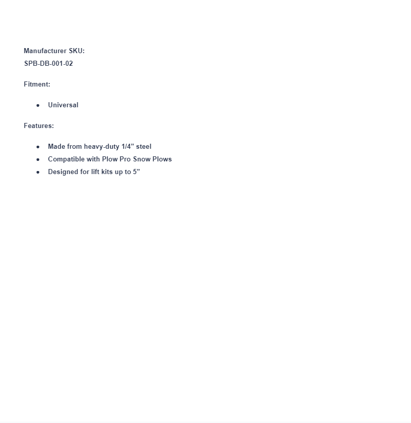 These snow plow drop brackets work best for lifts up to 5” high. They mount straight to your Plow Pro Snow Plow and drop your blade into the optimal plowing range. From there, you can adjust the blade’s tilt angle as you normally would, and then get to plowing.