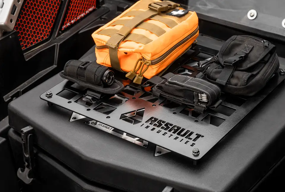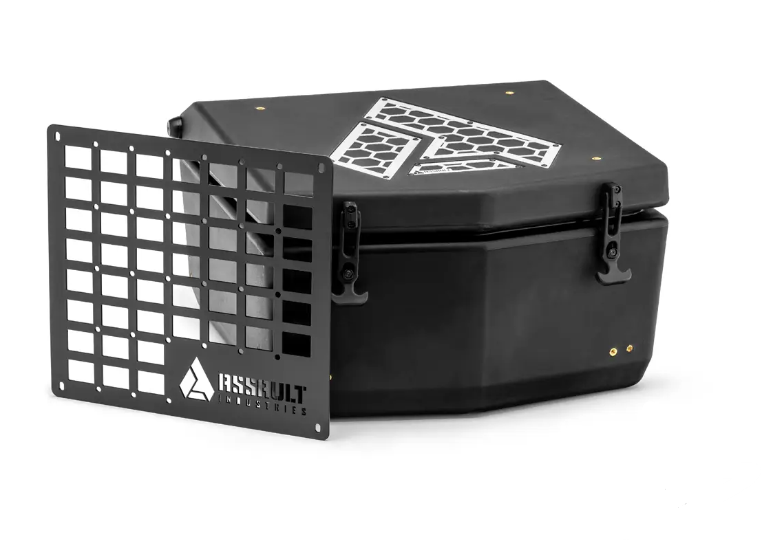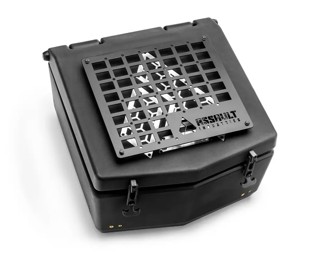 This box includes a MOLLE panel that can be mounted on the outside or inside of the lid. Externally, it provides easy access to MOLLE-ready accessories, while internally, it safeguards your gear from the sun and dust. The square slots accommodate 6 mm bolts, making it perfect for small clamps and additional accessories. Plus, the stylish Assault logo cover adds a touch of flair to your machine.