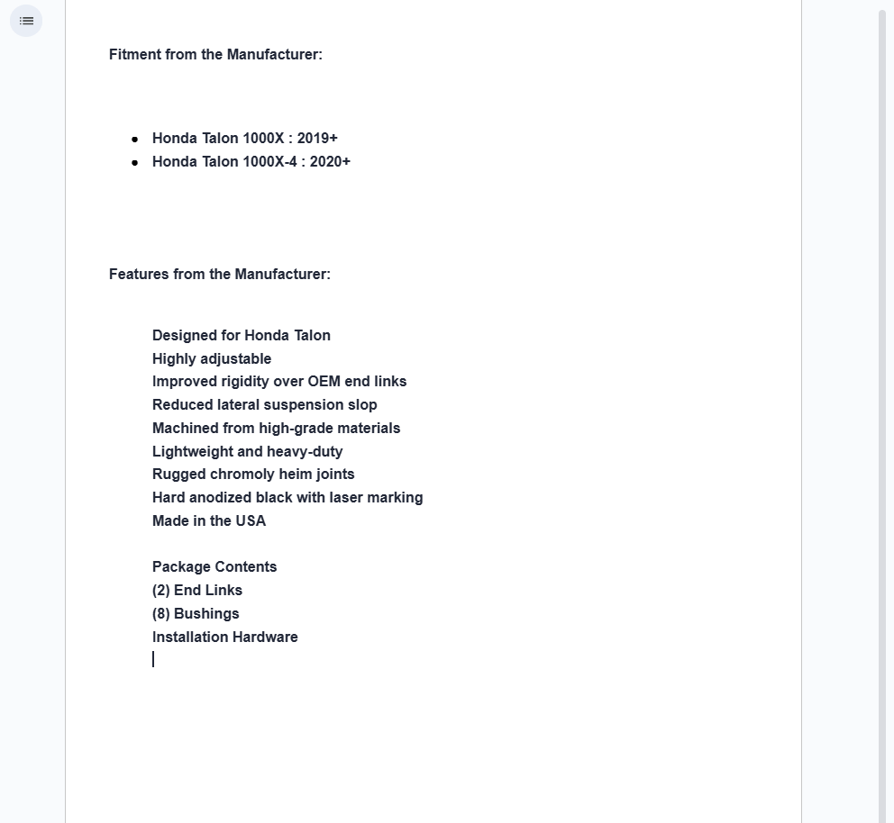 Assault Industries Heavy Duty Sway Bar End Links for Honda Talon are lightweight, rugged and fully adjustable. These end links are designed to replace the more flimsy OEM units and provide improved handling. Integrating a high degree of adjustability enables you to dial in the exact setting for your UTV’s suspension set up.