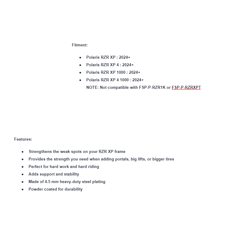 - Polaris RZR XP 4 1000 : 2024+NOTE:Not compatible with FSP-P-RZR1K or FSP-P-RZRXPT