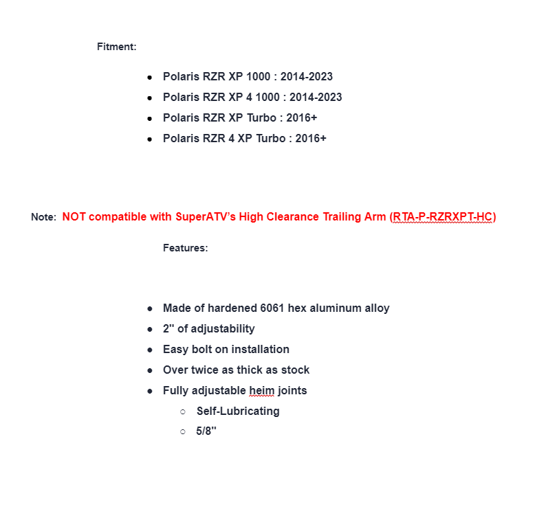 NOTE: NOT compatible with SuperATV’s High Clearance Trailing Arm (RTA-P-RZRXPT-HC)