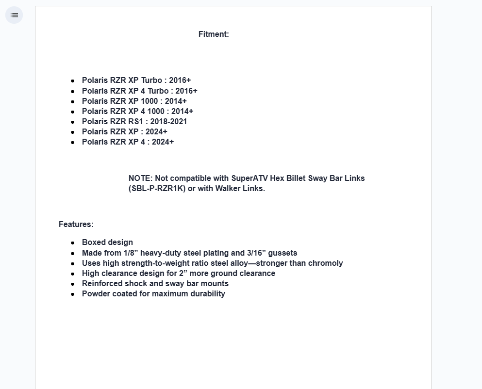 NOTE: Not compatible with SuperATV Hex Billet Sway Bar Links (SBL-P-RZR1K) or with Walker Links.
