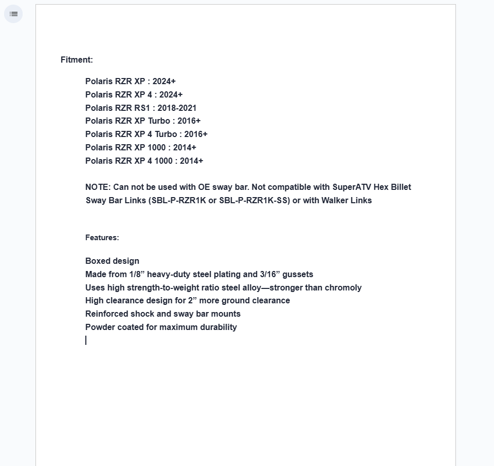 NOTE: Can not be used with OE sway bar. Not compatible with SuperATV Hex Billet Sway Bar Links (SBL-P-RZR1K or SBL-P-RZR1K-SS) or with Walker Links.