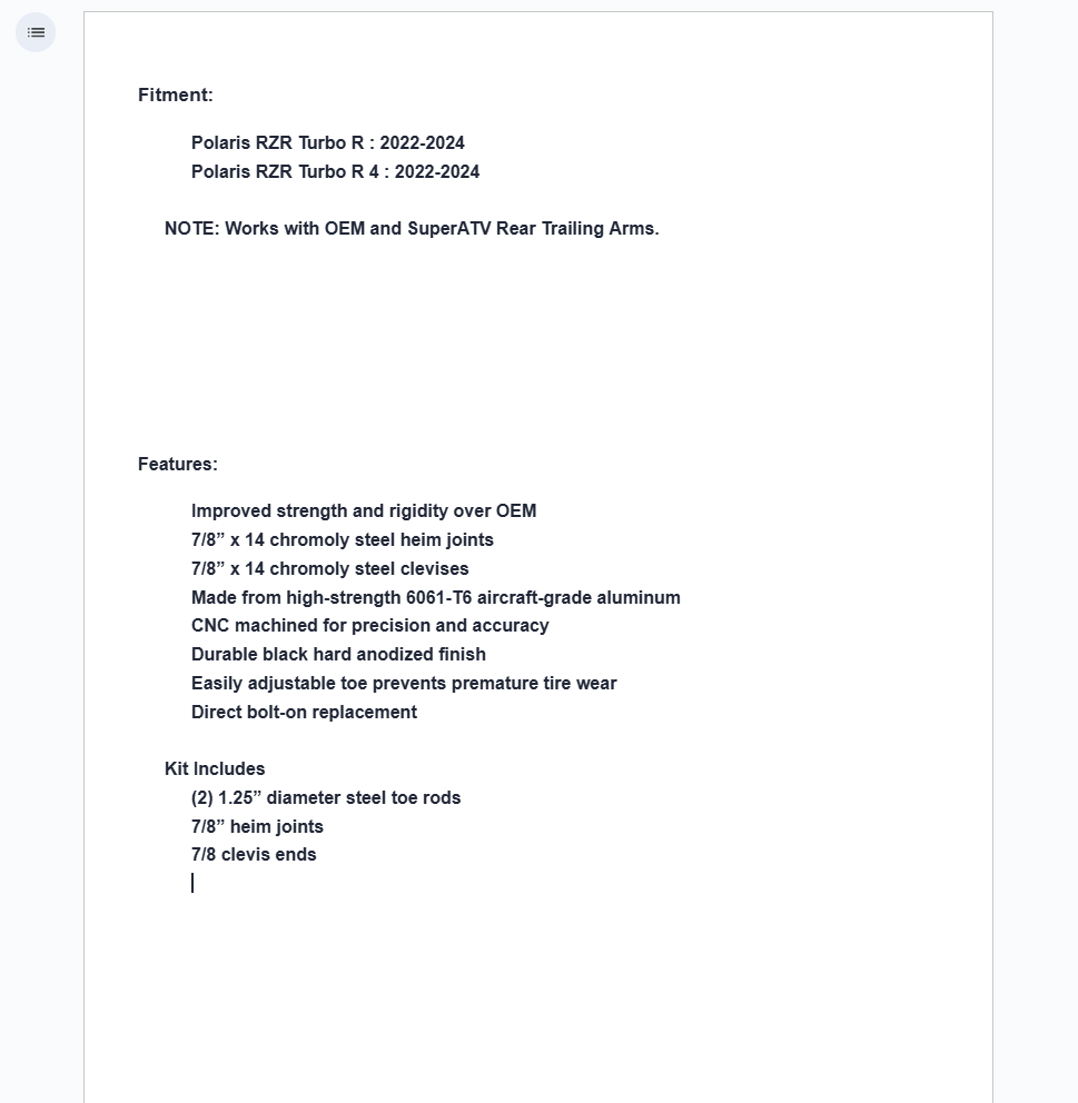 Rough riding can really wreak havoc on your machine’s OEM toe links—but who takes it easy on their Turbo R? Upgrade your machine with SuperATV’s Polaris RZR Turbo R Rear Toe Link Kit. It’s super tough thanks to 4130 chromoly construction, 7/8” heim joints, and 7/8” clevis ends—they’re superior to factory toe links in every way. And it’s simple to adjust your toe on the fly. Get SuperATV’s rear suspension toe rods for your RZR Turbo R and stop worrying about rough rides knocking your rear tires around.