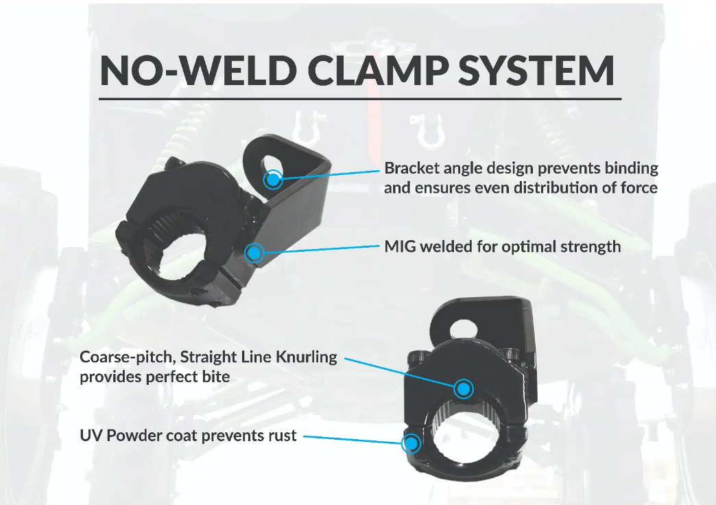 We know what we’re doing and we know the difference between track bars that rock and track bars that suck. Ours rock. Our clamps are big and beefy—our tests show that they won’t break when properly installed so there’s no need to weld. And even though they’re big, our clamps only hang down a couple inches to minimize clearance loss.