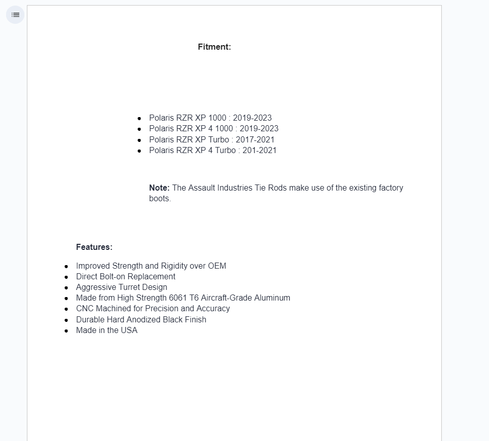 The Assault Industries barrel style heavy duty tie rod kit for the Polaris RZR XP 1000 is made from high strength 6061 T6 aircraft-grade aluminum and is designed and manufactured in the USA. This kit eliminates the factory break points while retaining the factory clevis assembly. The tie rods come in a hard anodized matte black finish with the Assault Industries logo laser engraved so everyone will know you run the best of the best!