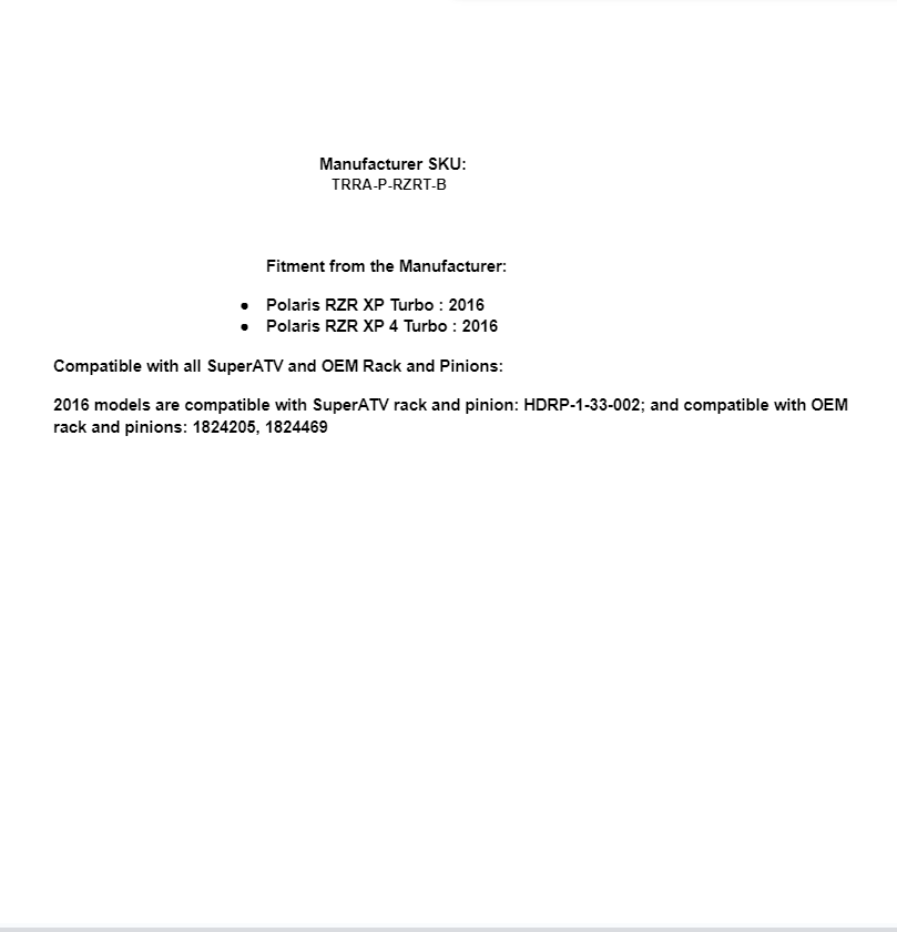 2016 models are compatible with SuperATV rack and pinion: HDRP-1-33-002; and compatible with OEM rack and pinions: 1824205, 1824469