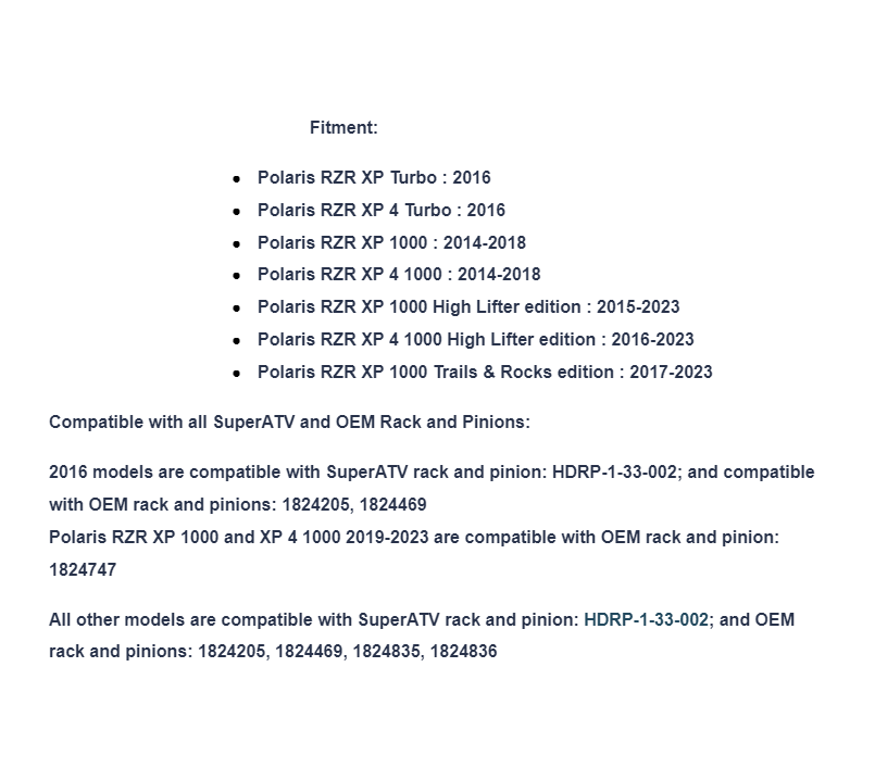 All other models are compatible with SuperATV rack and pinion: HDRP-1-33-002; and OEM rack and pinions: 1824205, 1824469, 1824835, 1824836
