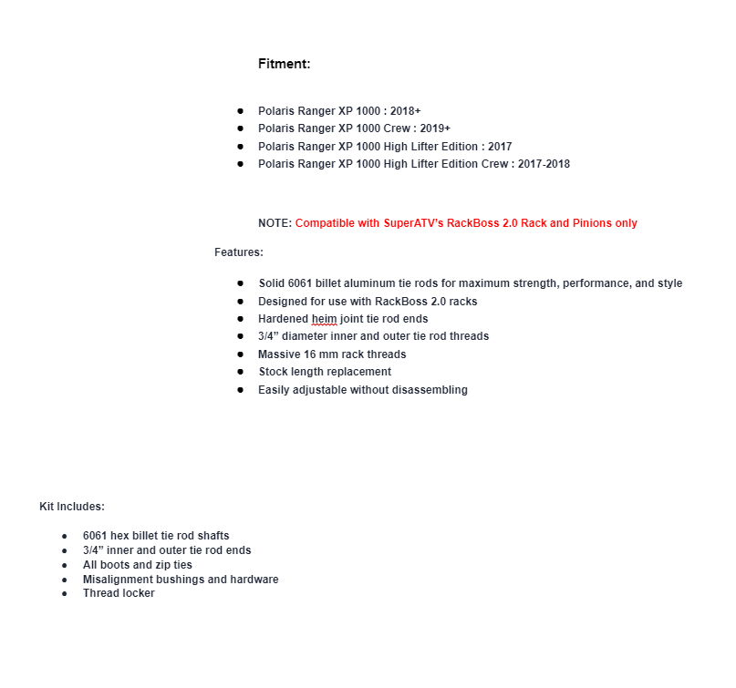 | Polaris | Ranger Crew XP 1000 | EPS | 2018 | Compatible with SuperATV’s RackBoss 2.0 Rack and Pinions only |