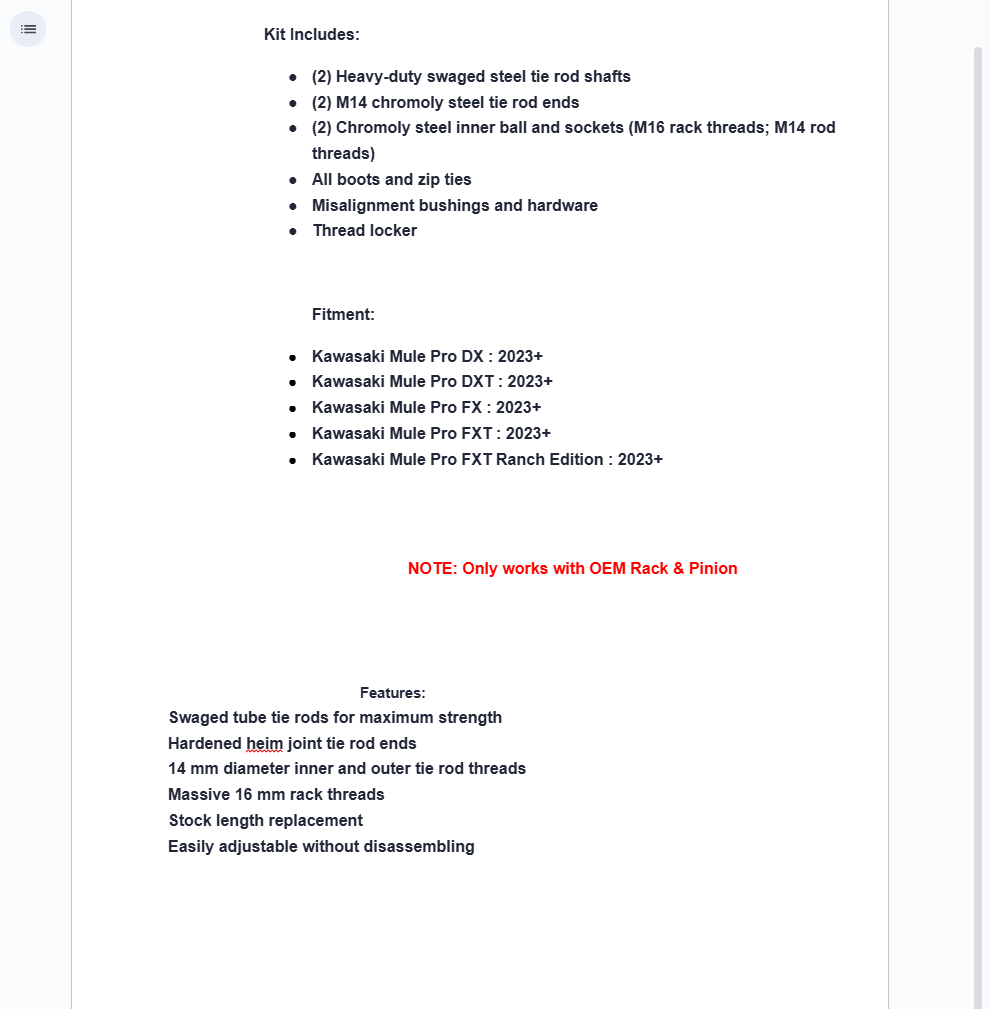Your Kawasaki Mule Pro tie rod kit comes with every nut, bolt, and zip tie you need to install it quickly. We also made it easy to adjust—just loosen the jam nuts and turn the rod without removing any components.