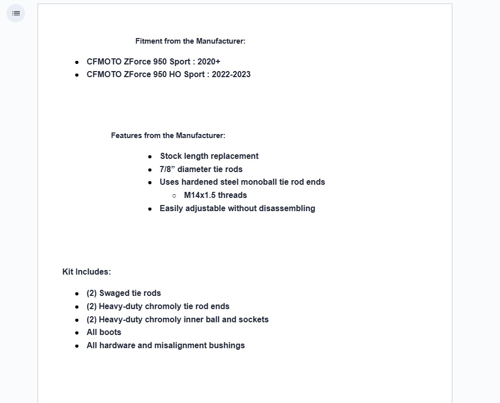 You like to push your ZForce—it’s a sport machine, after all. But if you push your stock tie rods beyond their limits, you’re going to be a in world of hurt. Upgrade to SuperATV’s CFMOTO ZForce 950 Swaged Tie Rod Kit. It’s way stronger than your ZForce’s OEM tie rods, giving you more confidence on every whoop, jump, and rough ride.