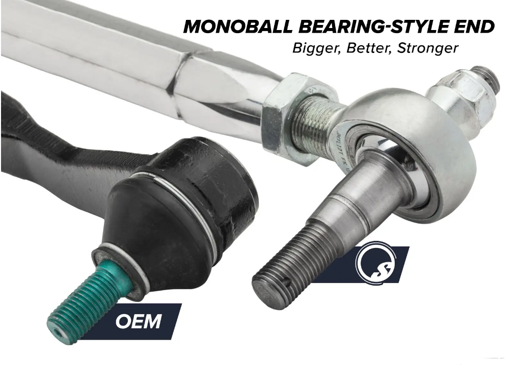 These tie rods are all about giving you the freedom to ride how you want. Whether you like to run big tires or just push the limits with your lead foot, our 1” diameter solid steel tie rods can take the heat. But it’s our tie rod ends that really push it over the top. Both use massive 3/4” rod threads and the rebuildable inners use 16 mm rack threads. These unbeatable ends make the obvious weak spot stronger than ever.