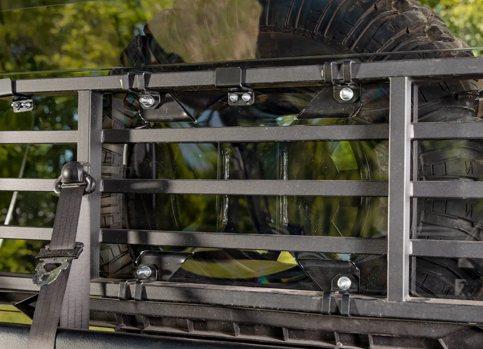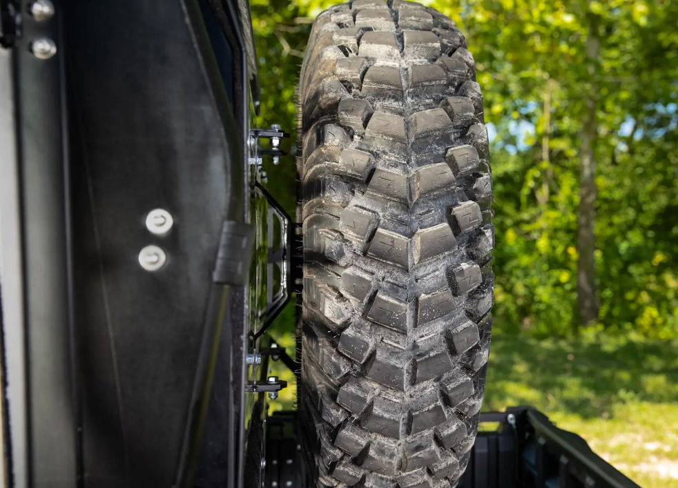 Sure, you could just throw a spare tire in your bed and call it a day. But that’s problematic for a couple of reasons. First, you’re sacrificing all of your rear cargo space by doing that. And second, it’s not the safest method. That’s why a spare tire carrier is a must. This one installs to the headache rack, directly behind your head. It frees up your cargo area so you still have somewhere to put your tools, cooler, or other gear. Your spare tire will be out of the way while you ride, and it moves with the headache rack when you convert between three and six-seat modes. You’ll have easy access the next time you get a flat.