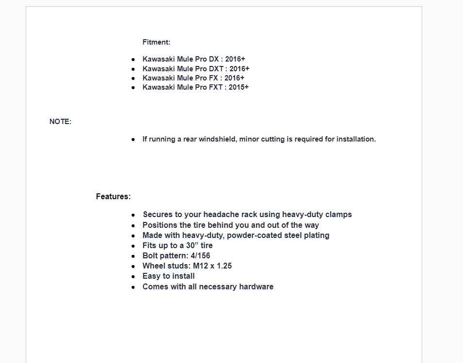 Is there such a thing as being too prepared? We don’t think so. Preparation is key on the trails, which is why your Kawasaki Mule Pro needs this Spare Tire Carrier from SuperATV. It gives you a secure place to keep your spare while you’re riding. Never again will you get sidelined with a popped tire and no backup plan! Our spare tire carrier is made with tough, powder-coated steel to endure years of exposure to the elements.