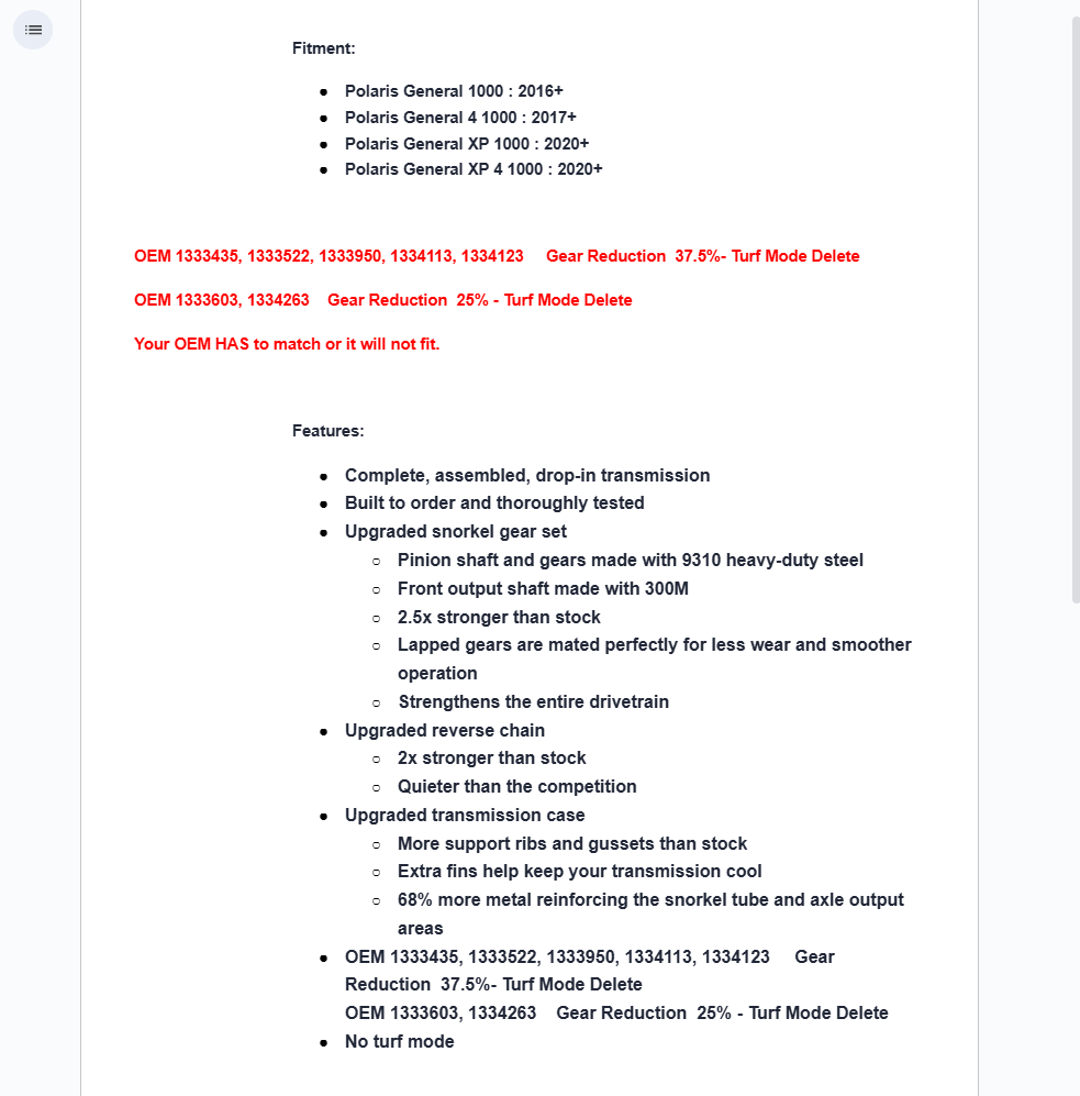 You’re the kind of person that likes to put the pedal down and enjoy the balls-to-the-wall action your General is capable of… even if your stock tranny isn’t. Our Polaris General XP 1000 Complete Heavy-Duty Transmission is for people like you. Our built-to-order trannies are tested thoroughly before shipping to make sure you get the quality and performance you need. They’re also upgraded inside and out with lapped gears that won’t slip and a beefed up case. They even have the option to delete turf mode to boost overall durability. Every part is better than stock to give you the power and performance you need.