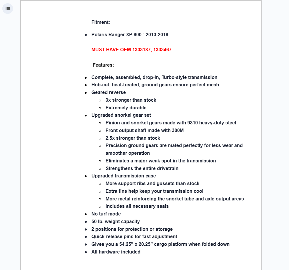 Your Ranger is known as the lifesaver on the trail—always winching out your buddy’s machines when the trail is too much for them to handle. You need a transmission that can handle being thrown into reverse when you’re stuck in a rut and need lots of power. That’s why we made a geared-reverse transmission specifically for your Polaris Ranger XP 900. It ditches OEM’s weak reverse chain altogether. Experience a massive upgrade featuring geared reverse, enhanced pinion and snorkel gears, a strengthened retainer ring, and a more robust case. Our clever design allows you to install it without making any modifications!