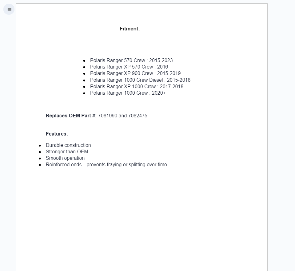 You need a shift cable that can keep up with your style of riding. Our cable replacement is made from high-quality materials and outperforms OEM with a 365 pound-force. It can handle the stop-and-go’s, pulling, and shifting on the trail without breaking or snapping.