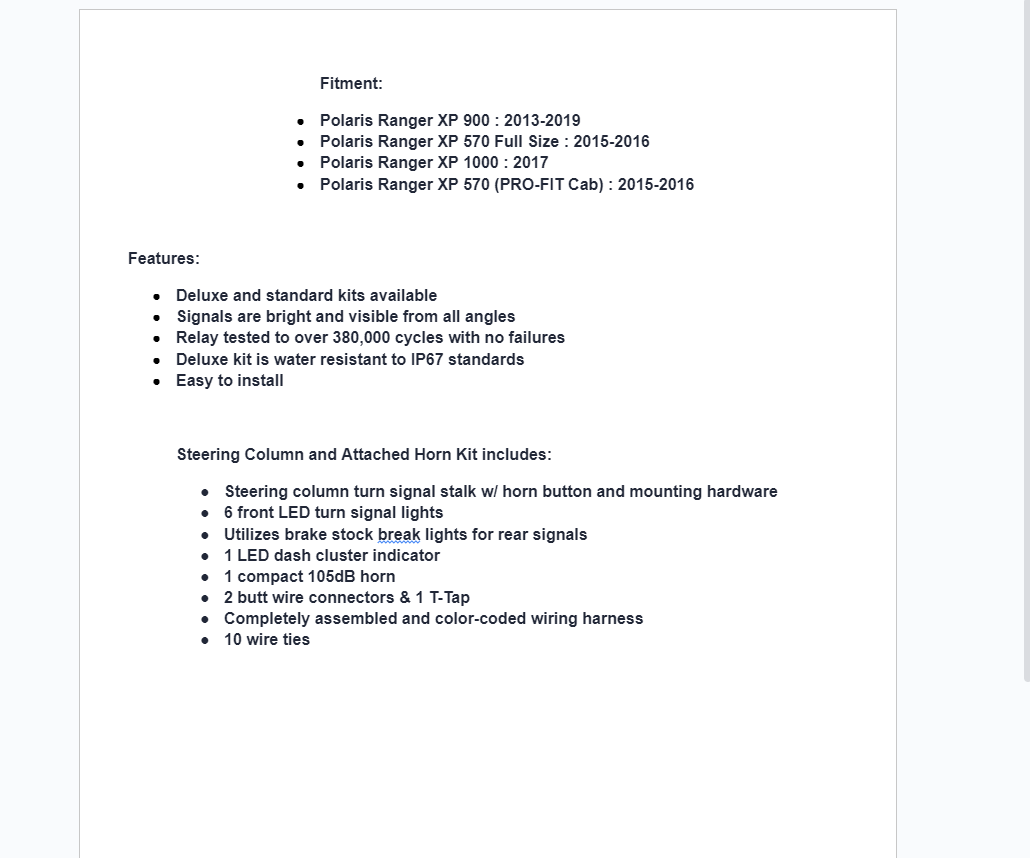 This kit also comes with a 105 dB horn to make sure you have everything you need to get ready for road riding. We even include an LED dash cluster indicator so you always know when you’re flashing. It really is everything you need to make your Ranger road-ready!