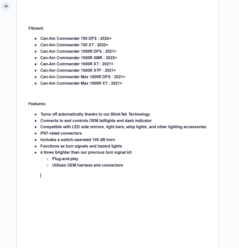 Our BlinkTek Technology makes sure that the turn signals, your dash indicator, OEM taillights, and any other connected lighted accessories all sync up and blink together. Just connect the lights you want to use with our included splice kit and they’ll all blink simultaneously when you use the hazard lights or on each side as turn signals.