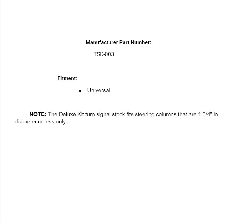 NOTE: The Deluxe Kit turn signal stock fits steering columns that are 1 3/4” in diameter or less only.