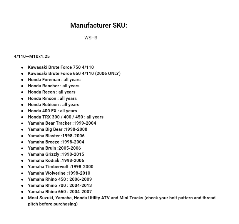 - Most Suzuki, Yamaha, Honda Utility ATV and Mini Trucks (check your bolt pattern and thread pitch before purchasing)