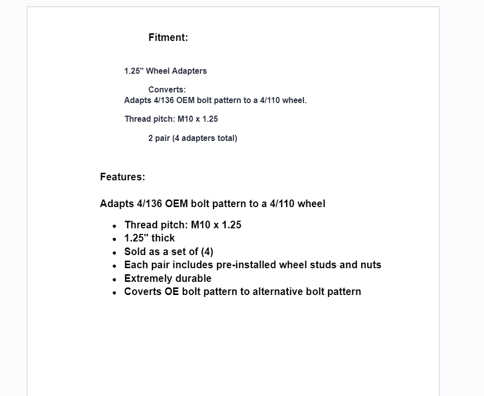 - Adapts 4/136 OEM bolt pattern to a 4/110 wheel