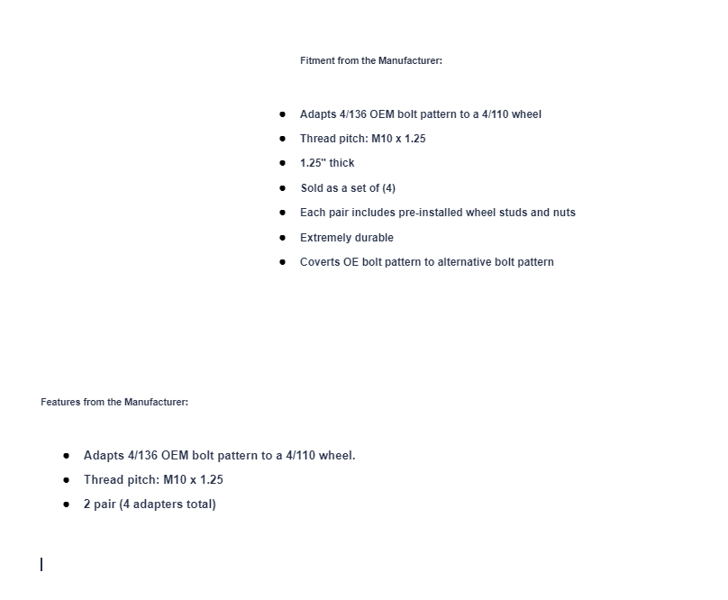 - Adapts 4/136 OEM bolt pattern to a 4/110 wheel