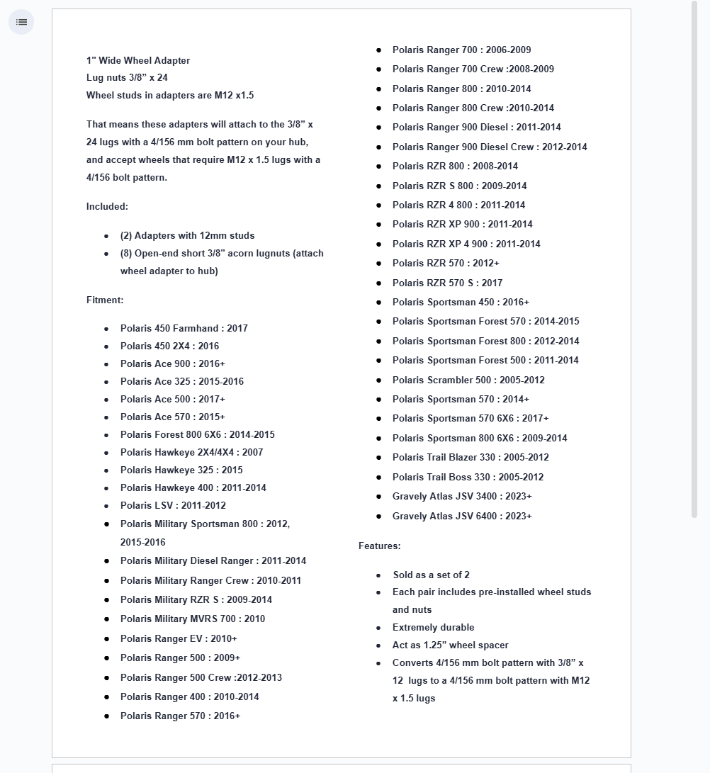 | Features | Converts 4/156 mm bolt pattern with 3/8” x 24 lugs to a 4/156 mm bolt pattern with M12 x 1.5 lugs |